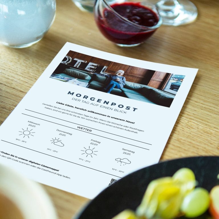 Mit dem Online-Editor für Ihre Hotelzeitung erstellen Sie diese ab sofort in wenigen Minuten. Überraschen Sie Ihre Gäste am Frühstückstisch mit Ihrer persönlichen Lektüre inkl. aktuellen Infos, Angeboten und Tipps für den Tag.