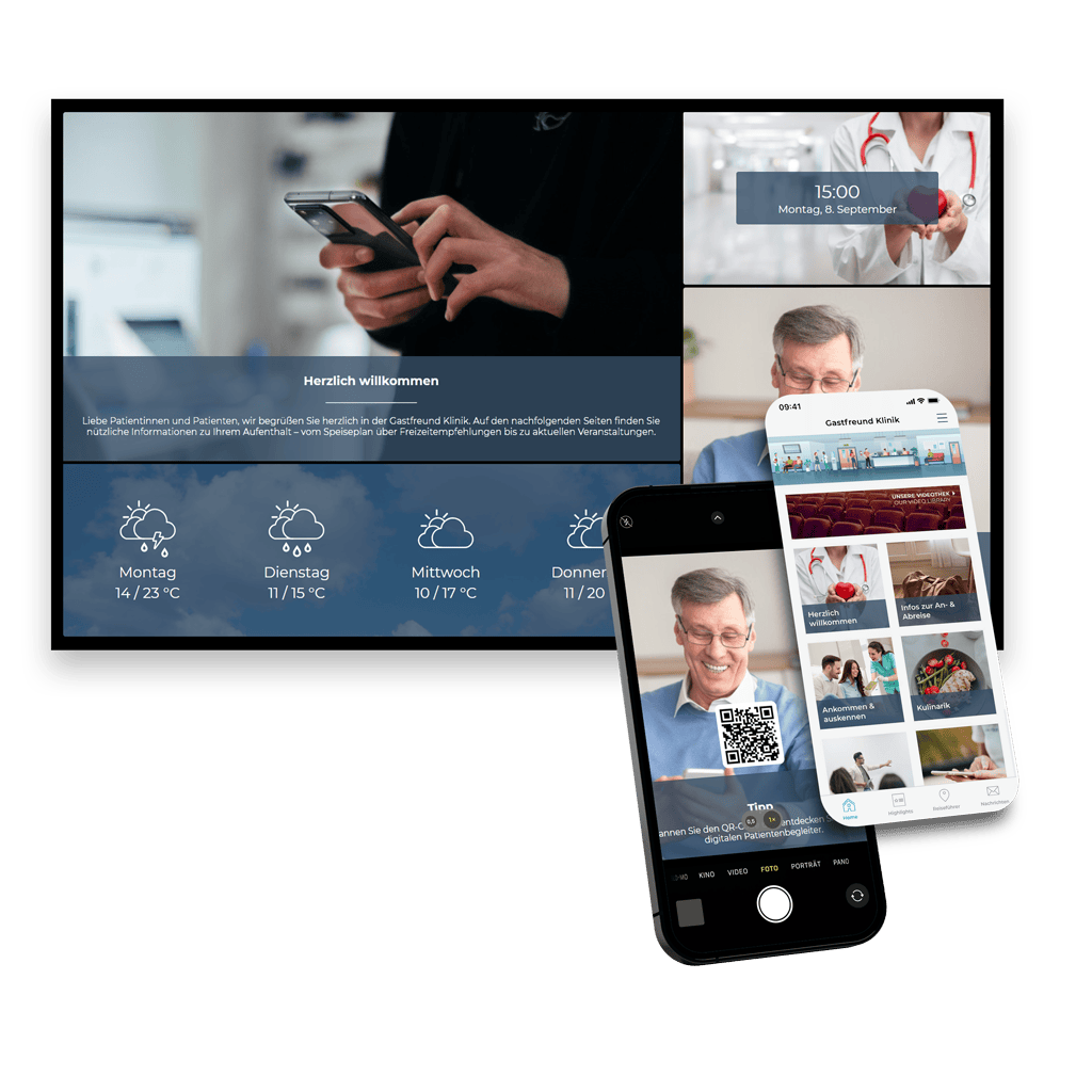 Durch die Vernetzung des Infokanals mit dem digitalen Patientenbegleiter, der Klinik-App, entsteht ein nahtloses Informations- und Serviceerlebnis. Über QR-Codes auf den Bildschirmen gelangen Patient:innen und Besucher:innen direkt zu weiterführenden Inhalten, Angeboten und Services im Patientenbegleiter – einfach per Smartphone. So verbinden Sie die Reichweite des Infokanals mit der Interaktivität der App.